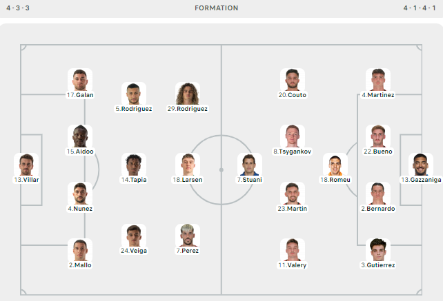 - Celta Vigo: Villar; Vazquez, Aidoo, Nunez, Galan; Rodriguez, Veiga; Perez, Cervi; Seferovic, Larsen.