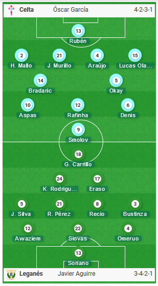 Leganes: Soriano; Bustinza, Omeruo, Awaziem, Siovas, Jonathan Silva; Recio, Rubén Pérez, Kevin Rodrigues, Eraso; Guido Carrillo.