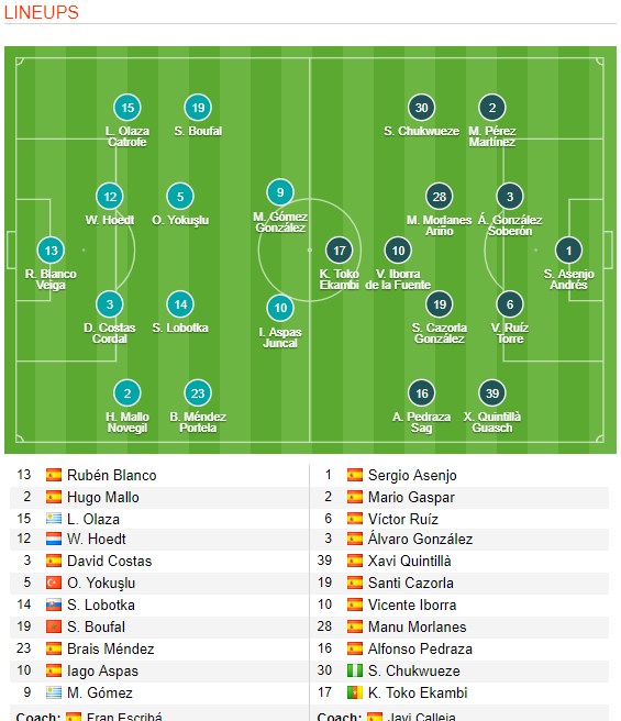 AEGoal.net cập nhật chính xác ĐỘI HÌNH RA SÂN trận Celta Vigo vs Villarreal diễn ra lúc 0h30 ngày 31/3 trong khuôn khổ Vòng 29 La Liga.