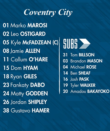 Coventry: Fankaty Dabo, Jodi Jones, Julien Da Costa và Liam Kelly chấn thương.