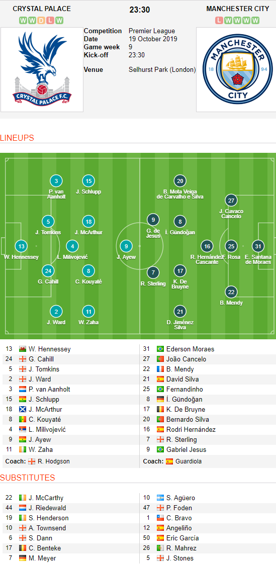 AEGoal.net cập nhật chính xác ĐỘI HÌNH RA SÂN trận Crystal Palace vs Man City diễn ra lúc 23h30 ngày 19/10 trong khuôn khổ Vòng 9 giải Ngoại Hạng Anh.