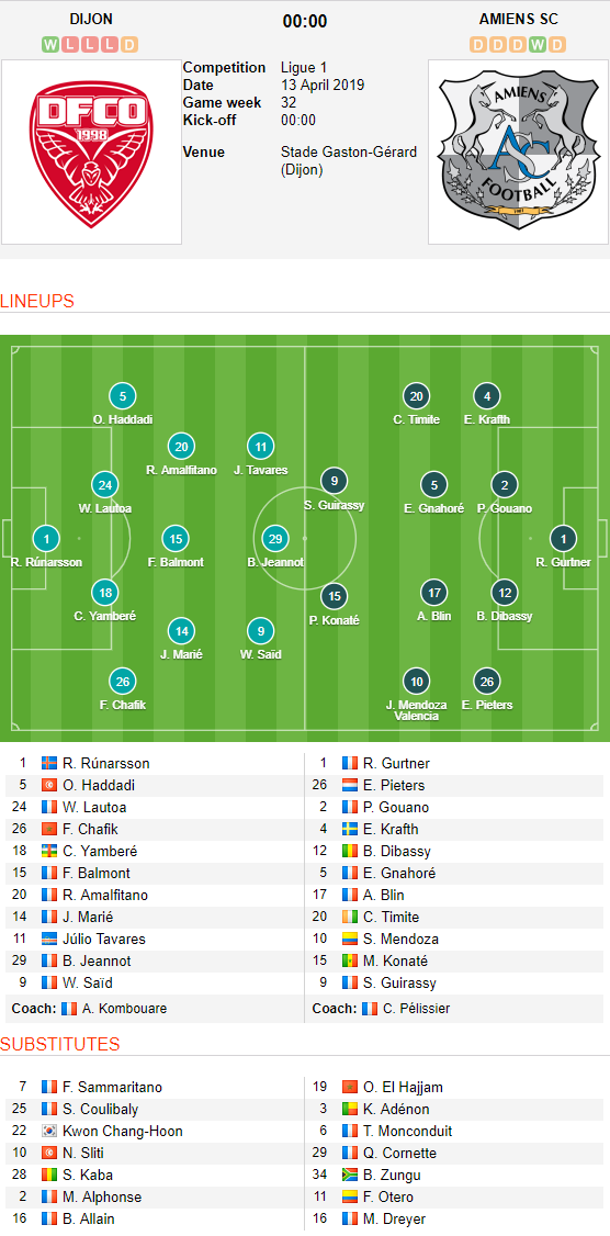 Dijon (4-1-4-1): Rúnarsson; Lautoa, Yamberé, Chafik, Haddadi; Balmont; Marié, Saïd, Amalfitano, Tavares; Jeannot.