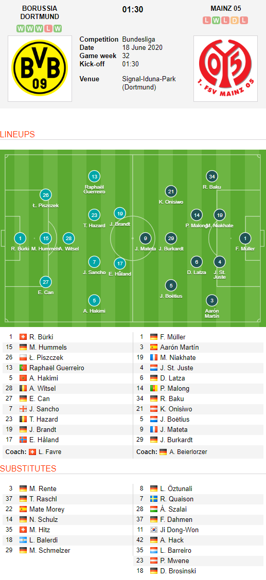 AEGoal.net cập nhật chính xác ĐỘI HÌNH RA SÂN trận Dortmund vs Mainz diễn ra lúc 01h30 ngày 18/6 trong khuôn khổ vòng 32 giải VĐQG Đức.