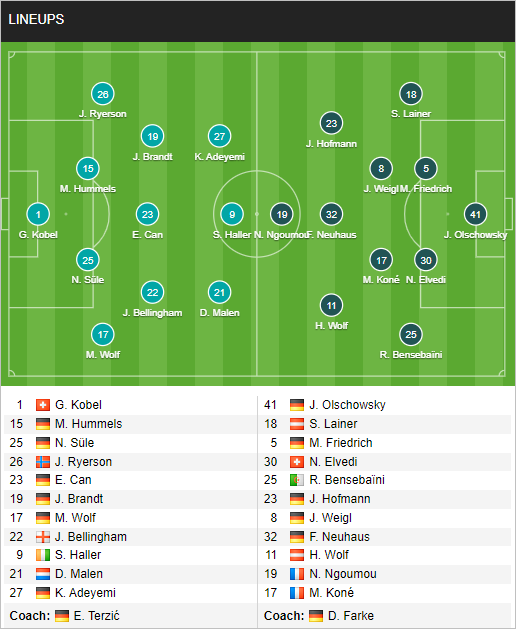 Dortmund: Kobel, Wolf, Sule, Hummels, Ryerson, Can, Bellingham, Brandt, Malen, Haller, Adeyemi.