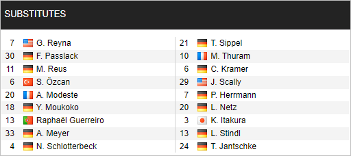 Monchengladbach: Omlin, Lainer, Friedrich, Elvedi, Bensebaini, Weigl, Kone, Hofmann, Neuhaus, Ngoumou, Plea.