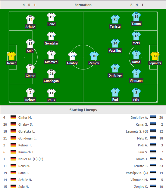 AEGoal.net cập nhật chính xác ĐỘI HÌNH RA SÂN trận Đức vs Estonia diễn ra lúc 01h45 ngày 12/6 trong khuôn khổ Bảng C - Vòng loại EURO 2020.