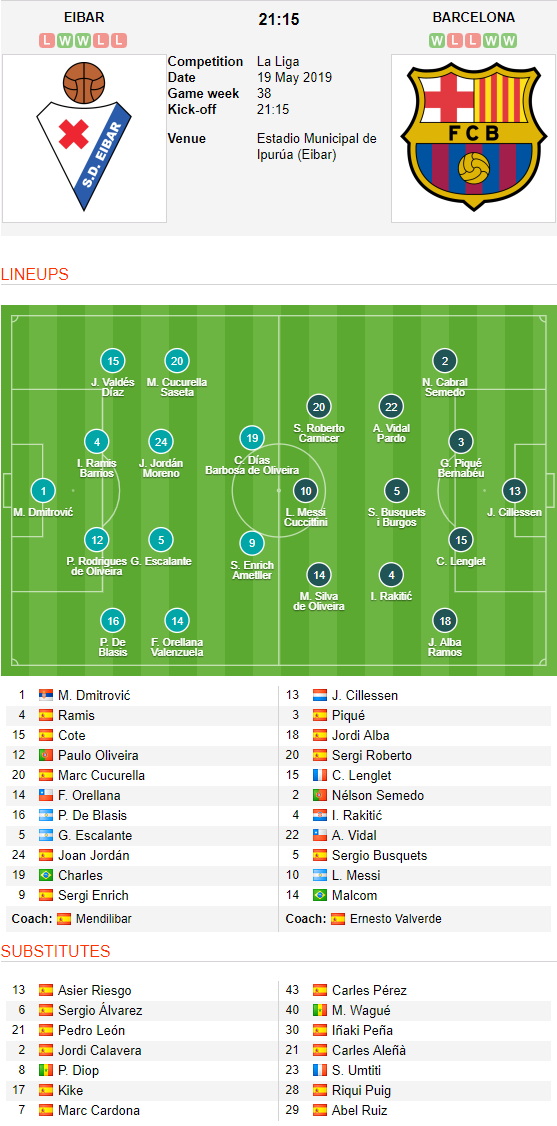 AEGoal.net cập nhật chính xác ĐỘI HÌNH RA SÂN trận Eibar vs Barcelona diễn ra lúc 21h15 ngày 19/5 trong khuôn khổ Vòng 38 - VĐQG Tây Ban Nha.