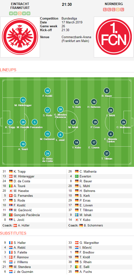 AEGoal.net cập nhật chính xác ĐỘI HÌNH RA SÂN trận Eintracht Frankfurt vs Nurnberg diễn ra lúc 21h30 ngày 17/3 trong khuôn khổ vòng 26 giải VĐQG Đức