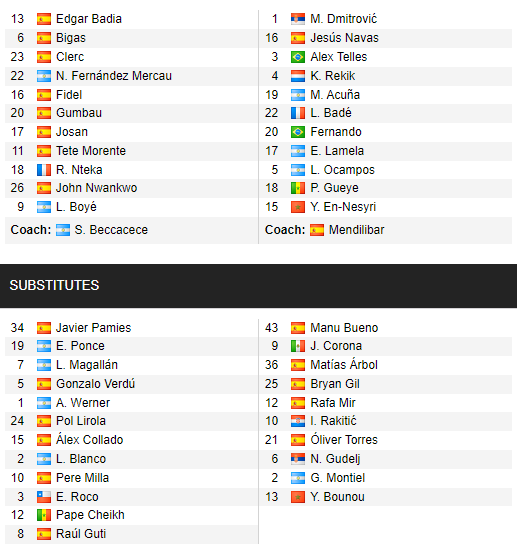 Sevilla (4-2-3-1): Dimitrovic; Montiel, Rekik, Gudelj, Telles; Rakitic, Gueye; Lamela, Torres, Gomez; Mir.