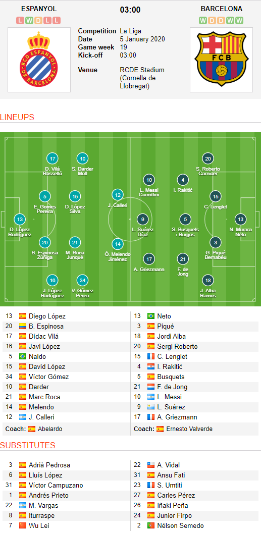 AEGoal.net cập nhật chính xác ĐỘI HÌNH RA SÂN trận Espanyol vs Barcelona diễn ra lúc 03h00 ngày 05/01 trong khuôn khổ vòng 19 giải VĐQG Tây Ban Nha.