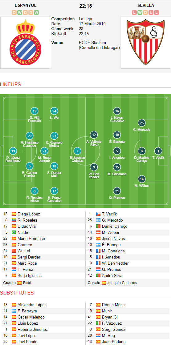 AEGoal.net cập nhật chính xác ĐỘI HÌNH RA SÂN trận Espanyol vs Sevilla diễn ra lúc 22h15 ngày 17/3 trong khuôn khổ vòng 28 giải VĐQG Tây Ban Nha - La Liga