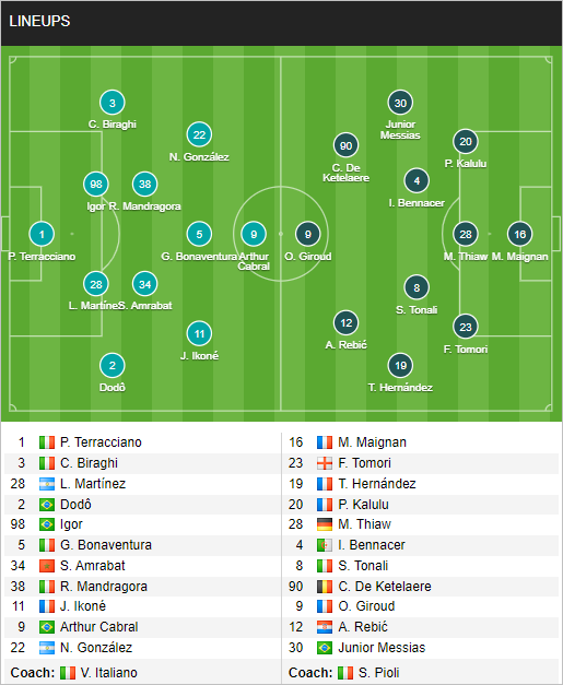 Fiorentina: Terracciano; Dodo, Milenkovic, Igor, Biraghi; Bonaventura, Amrabat, Mandragora; Ikone, Cabral, Kouame.