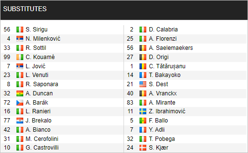 * Danh sách dự bị trận Fiorentina vs AC Milan (02h45 ngày 05/3)