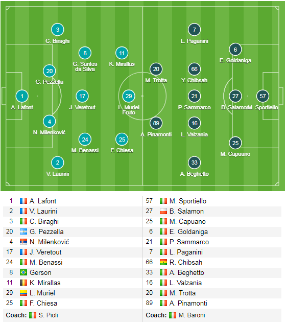 Fiorentina (4-3-3): Lafont - Biraghi, Hugo, Pezzella, Milenkovic - Benassi, Veretout, Gerson - Muriel, Simeone, Chiesa