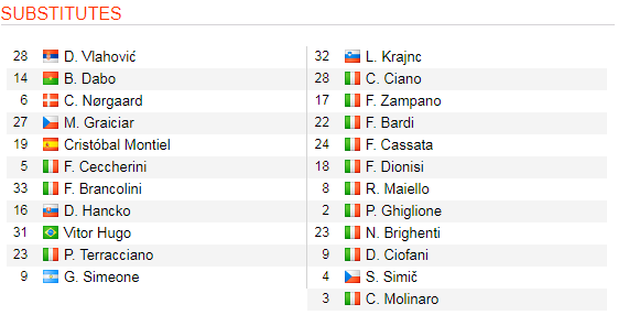 - Fiorentina: Edimilson Fernandes và Marko Pjaca vắng mặt vì chấn thương.