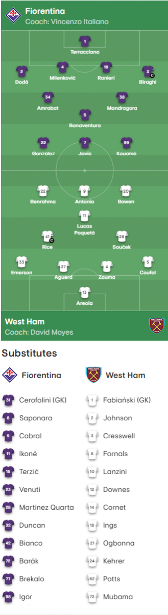 AEGoal cập nhật chính xác đội hình ra sân trận Fiorentina vs West Ham diễn ra lúc 02h00 ngày 8/6 trong khuôn khổ chung kết Europa Conference League.