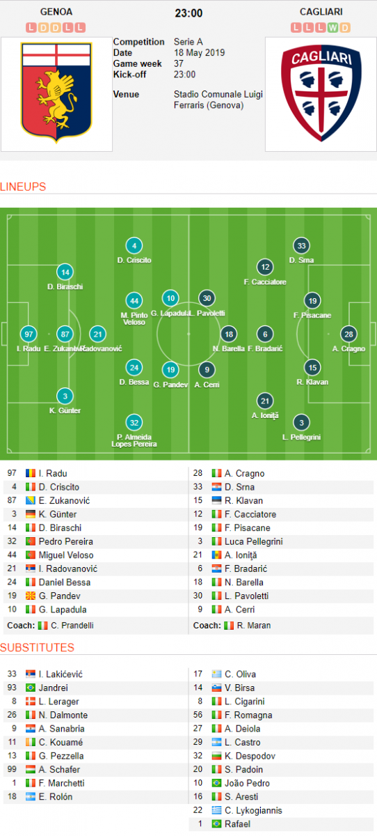 AEGoal.net cập nhật chính xác ĐỘI HÌNH RA SÂN trận Genoa vs Cagliari diễn ra lúc 23h00 ngày 18/5 trong khuôn khổ Vòng 37 - VĐQG Italia.