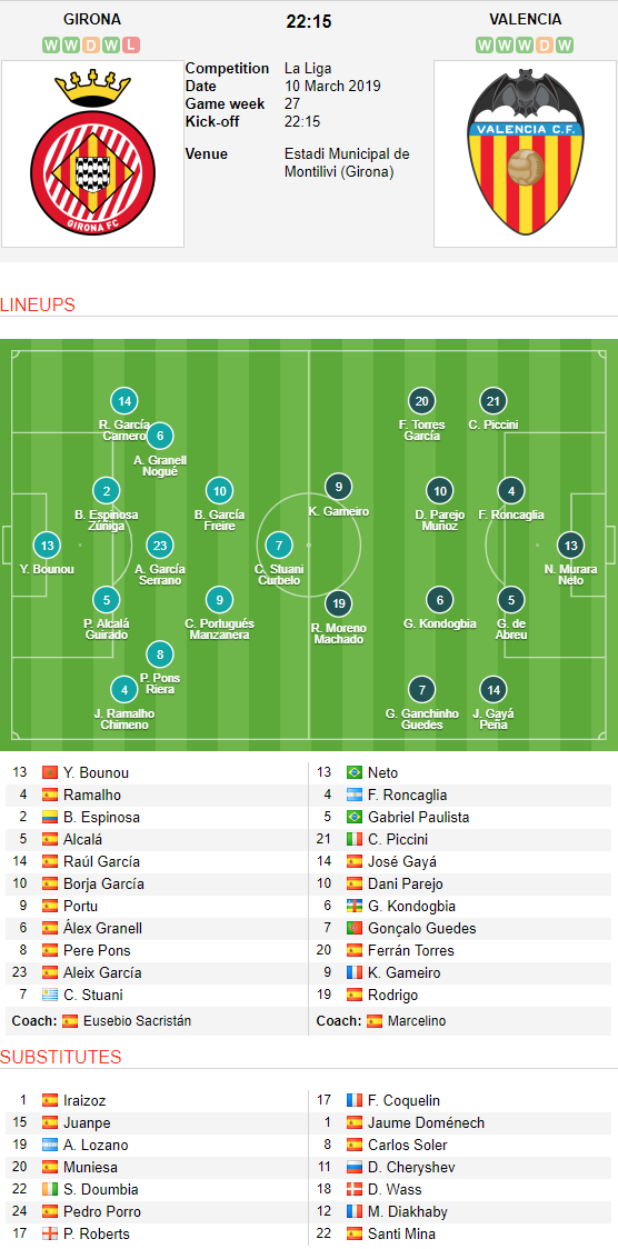 AEGoal.net cập nhật chính xác ĐỘI HÌNH RA SÂN trận Girona vs Valencia diễn ra lúc 22h15 ngày 10/03 trong khuôn khổ vòng 27 giải VĐQG Tây Ban Nha.