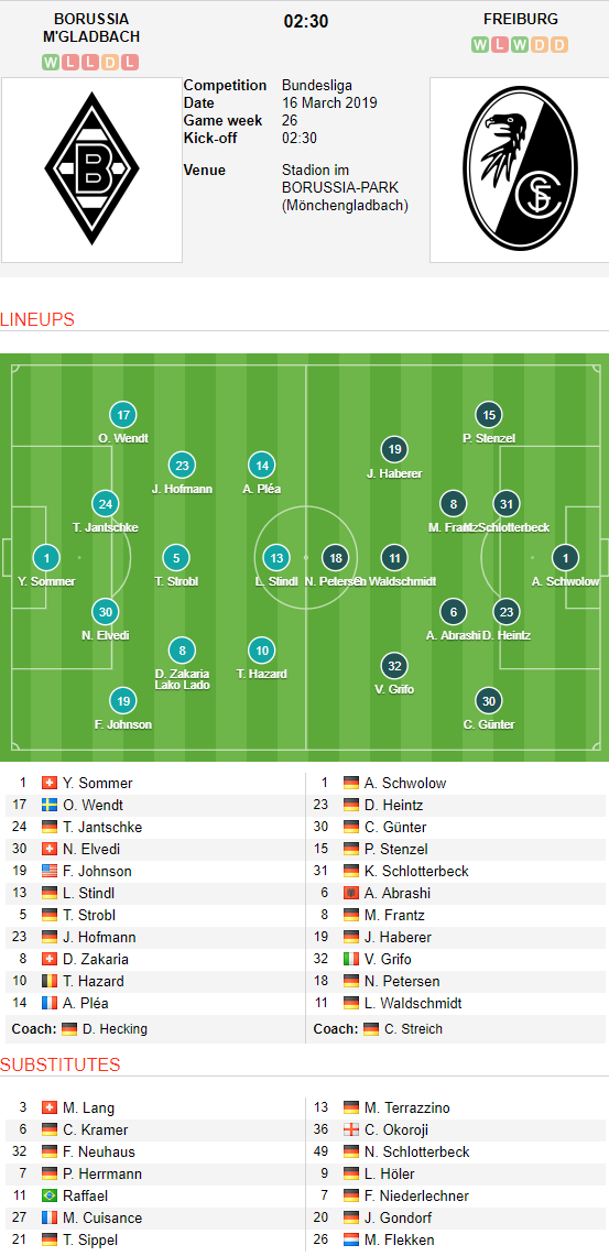 ĐỘI HÌNH RA SÂN trận Gladbach vs Freiburg, 02h30 ngày 16/3: VĐQG Đức