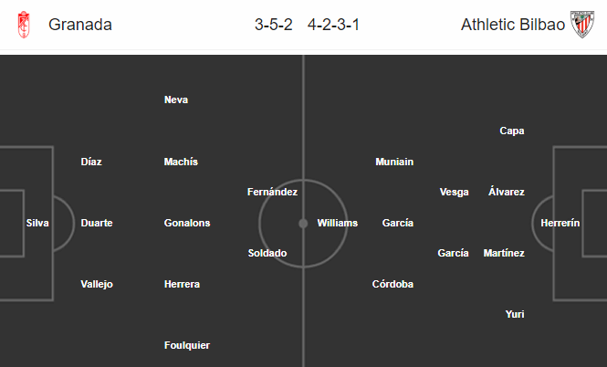AEGoal.net cập nhật chính xác ĐỘI HÌNH RA SÂN trận Granada vs Bilbao diễn ra lúc 03h00 ngày 06/03 trong khuôn khổ bán kết Cúp Nhà vua Tây Ban Nha.