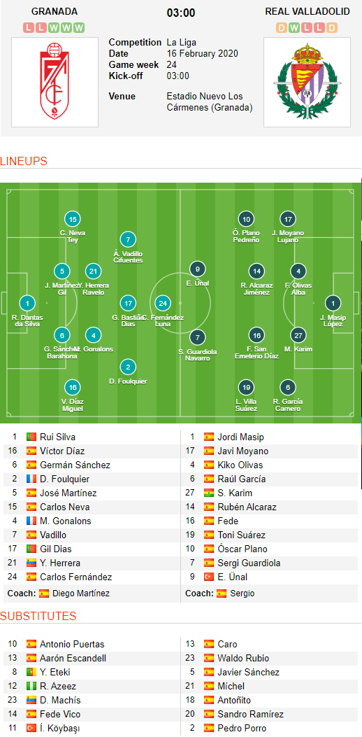 AEGoal.net cập nhật chính xác ĐỘI HÌNH RA SÂN trận Granada vs Valladolid diễn ra lúc 03h00 ngày 16/02 trong khuôn khổ giải VĐQG Tây Ban Nha.