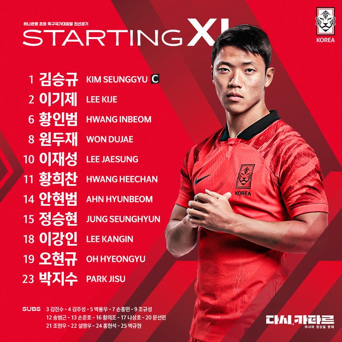 - Hàn Quốc (4-4-2): Seung-gyu - Young-woo, Seung-hyun, Ji-soo, Ki-je - Kang-in, Seon-min, In-beom, Jae-sung - Ui-jo, Heung-min