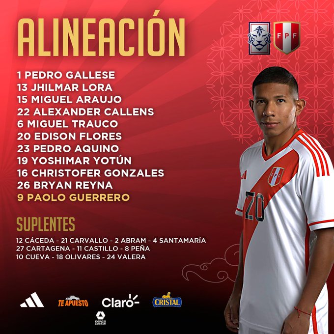 - Peru (4-2-3-1): Gallese - Lora, Santamaria, Araujo, Trauco - Cartagena, Aquino - Flores, Gonzales, Cueva – Lapadula