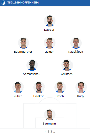 Hoffenheim: Baumann (c) - Kaderabek, Posch, Bicakcic, Zuber - Geiger - Rudy, Grillitsch, Samassekou - Dabbur, Baumgartner