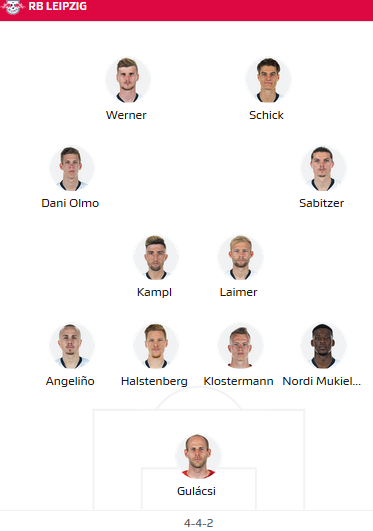 RB Leipzig: Gulacsi - Mukiele, Klostermann, Halstenberg, Angelino - Sabitzer (c), Laimer, Kampl, Nkunku - Schick, Werner