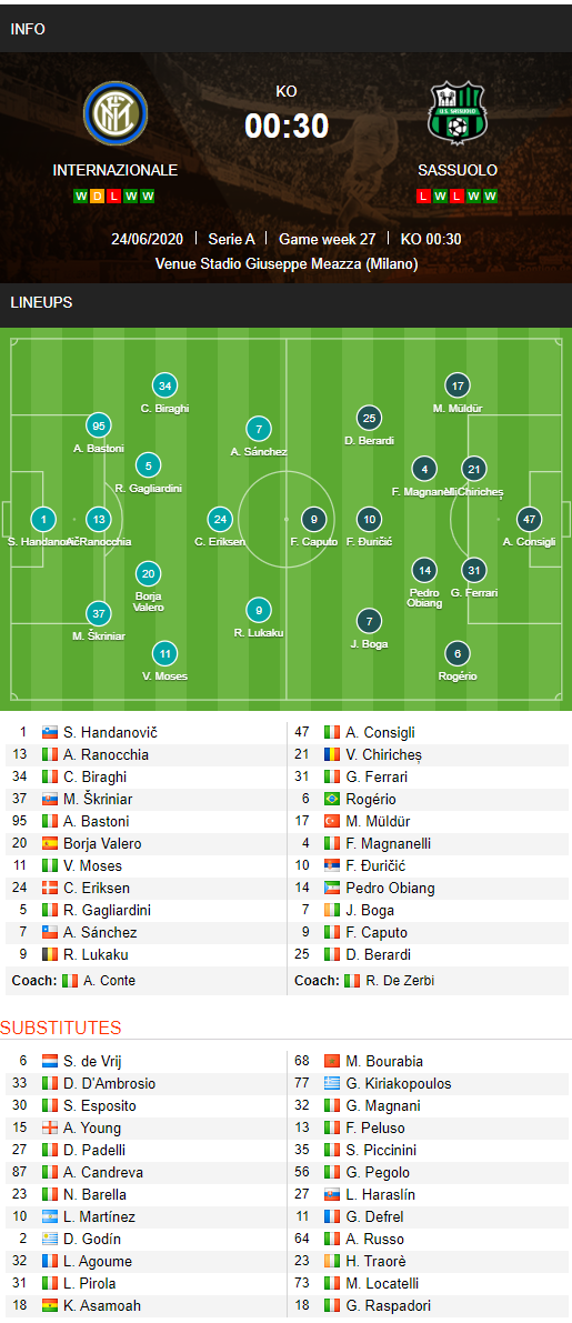 AEGoal.net cập nhật chính xác ĐỘI HÌNH RA SÂN trận Inter Milan vs Sassuolo diễn ra lúc 00h30 ngày 25/6 trong khuôn khổ giải VĐQG Italia.