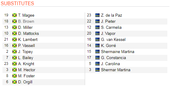- Curacao: Không có báo cáo về chấn thương; Gino van Kessel, Shermaine Martina, Jurich Carolina, Jurich Carolina đã phải nhận 1 thẻ vàng.