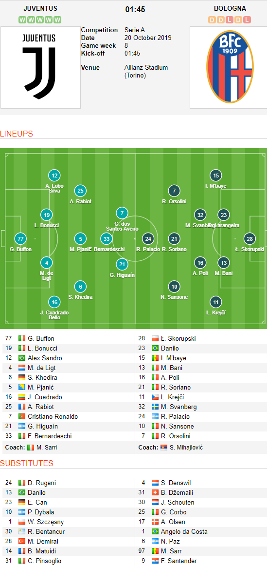 AEGoal.net cập nhật chính xác ĐỘI HÌNH RA SÂN trận Juventus vs Bologna diễn ra lúc 01h45 ngày 20/10 trong khuôn khổ Vòng 8 - VĐQG Italia.