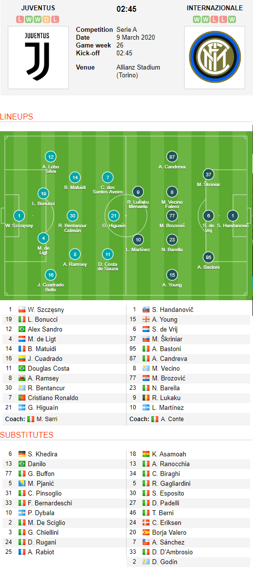 AEGoal.net cập nhật chính xác ĐỘI HÌNH RA SÂN trận Juventus vs Inter Milan diễn ra lúc 02h45 ngày 09/03 trong khuôn khổ giải VĐQG Italia.