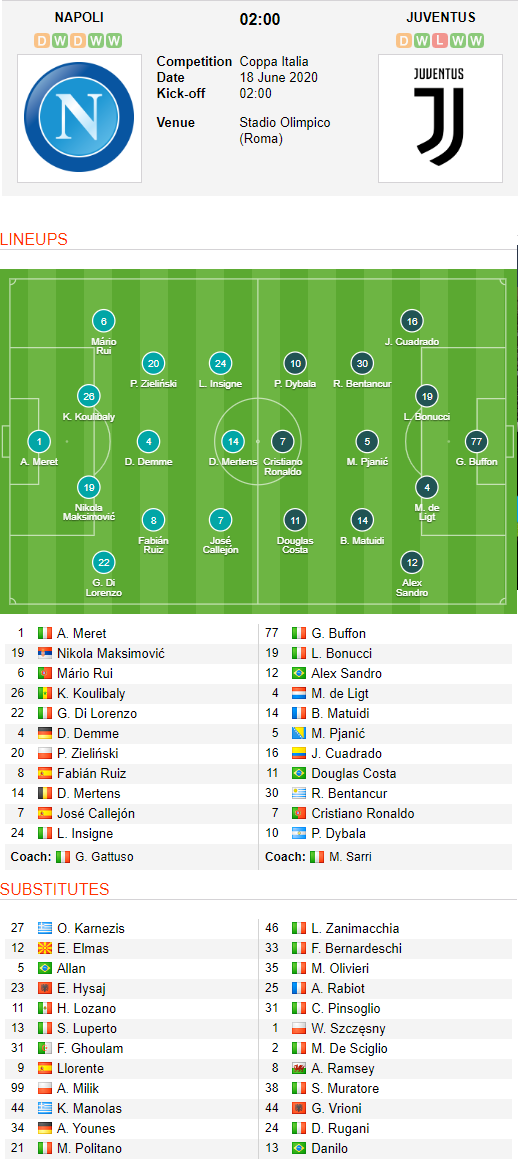 AEGoal.net cập nhật chính xác ĐỘI HÌNH RA SÂN trận Juventus vs Napoli diễn ra lúc 02h00 ngày 18/6 trong khuôn khổ chung kết Cúp QG Italia.
