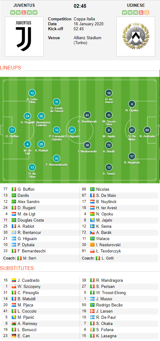 AEGoal.net cập nhật chính xác ĐỘI HÌNH RA SÂN trận Juventus vs Udinese diễn ra lúc 02h45 ngày 16/01 trong khuôn khổ Cúp QG Italia.
