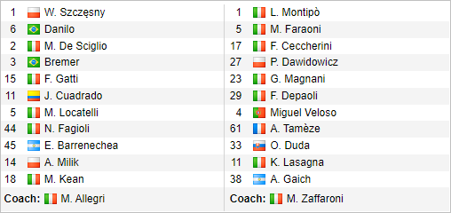 Juventus (3-5-2): Perin; Bremer, Rugani, Danilo; Di Maria, Locatelli, Barrenechea, Kostic, De Sciglio; Soule, Vlahovic.
