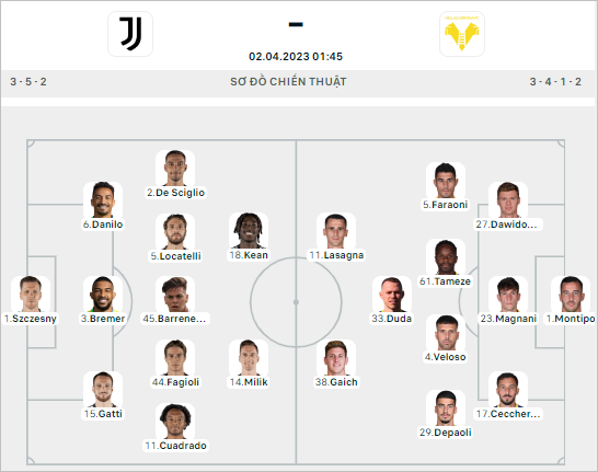 * Đội hình ra sân trận Juventus vs Verona (01h45 ngày 02/4)