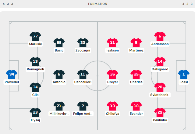 Lazio: Provedel; Hysaj, Gila, Romagnoli, Marusic; Vecino, Cataldi, Alberto; Anderson, Immobile, Zaccagni.
