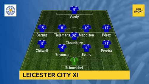 Leicester City XI: Schmeichel, Pereira, Evans, Soyuncu, Chilwell, Choudhury, Tielemans, Maddison, Barnes, Perez, Vardy