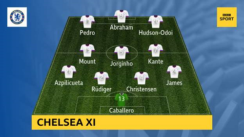 Chelsea XI: Caballero, James, Rudiger, Christensen, Azpilicueta, Jorginho, Kante, Mount, Abraham, Pedro, Hudson-Odoi