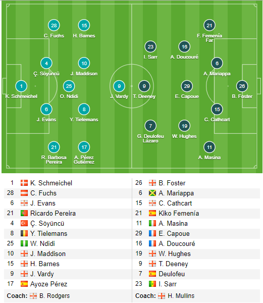 AEGoal.net cập nhật chính xác ĐỘI HÌNH RA SÂN trận Leicester City vs Watford diễn ra lúc 02h30 ngày 05/12 trong khuôn khổ Vòng 15 giải Ngoại Hạng Anh.