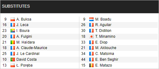 - Monaco: Jean Lucas vắng mặt vì lý do cá nhân; còn Gelson Martins, Breel Embolo và Ruben Aguilar vẫn bỏ ngỏ khả năng ra sân.