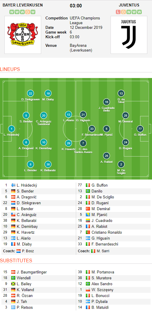 AEGoal.net cập nhật chính xác ĐỘI HÌNH RA SÂN trận Leverkusen vs Juventus diễn ra lúc 03h00 ngày 12/12 trong khuôn khổ vòng bảng UEFA Champions League.