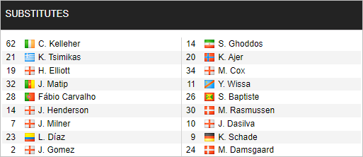 Liverpool (4-3-3): Alisson; Alexander-Arnold, Gomez, Van Dijk, Robertson; Jones, Fabinho, Henderson; Salah, Nunez, Gakpo.