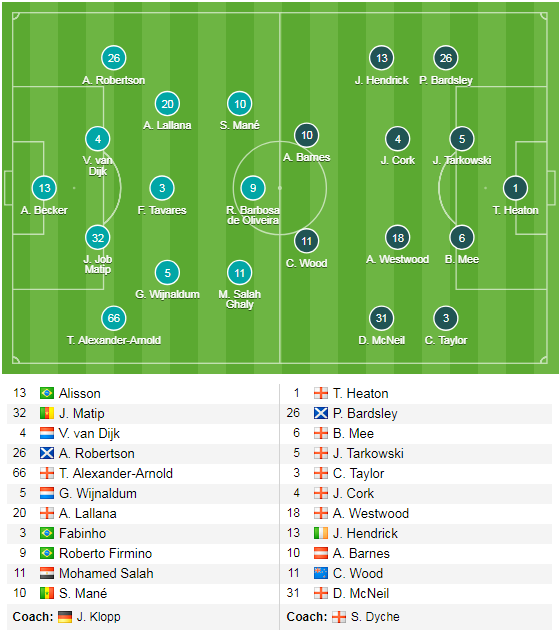 AEGoal.net cập nhật chính xác ĐỘI HÌNH RA SÂN trận Liverpool vs Burnley diễn ra lúc 19h00 ngày 10/3 trong khuôn khổ Vòng 30 giải Ngoại hạng Anh.