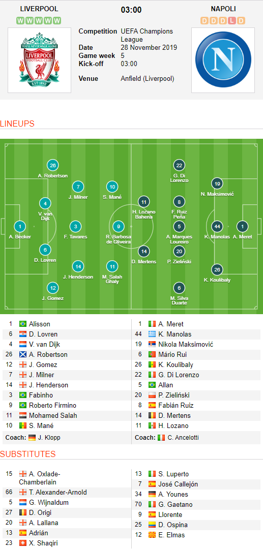 AEGoal.net cập nhật chính xác ĐỘI HÌNH RA SÂN trận Liverpool vs Napoli diễn ra lúc 03h00 ngày 28/11 trong khuôn khổ vòng bảng Cúp C1 châu Âu - UEFA Champions League.