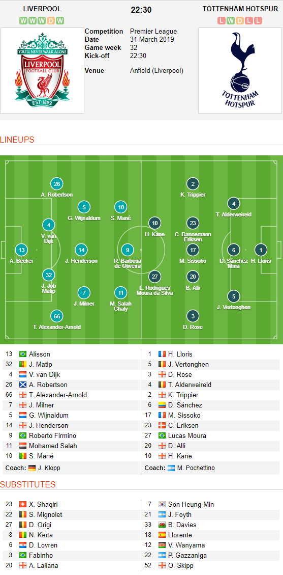 AEGoal.net cập nhật chính xác ĐỘI HÌNH RA SÂN trận Liverpool vs Tottenham diễn ra lúc 22h30 ngày 31/3 trong khuôn khổ Vòng 32 Ngoại hạng Anh.