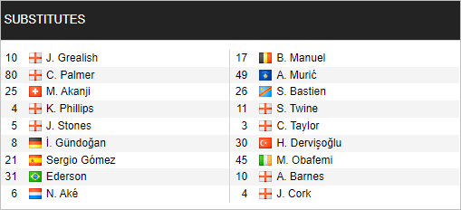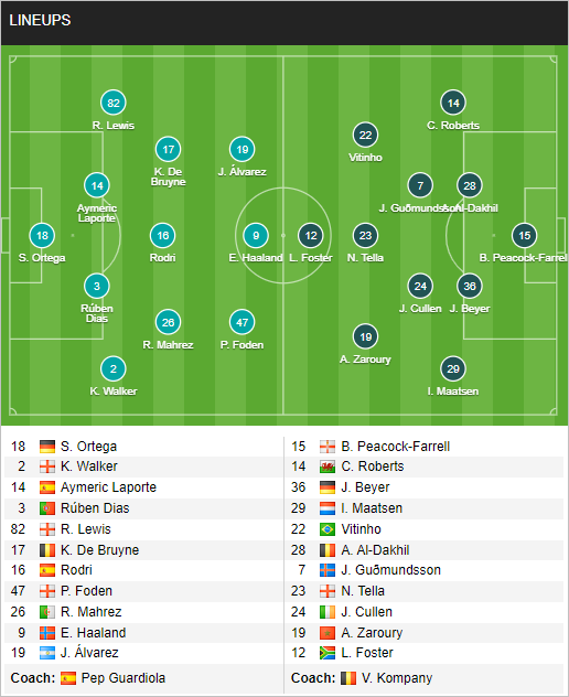 - Man City: Ortega; Lewis, Stones, Laporte, Ake; De Bruyne, Phillips, Bernardo; Mahrez, Alvarez, Foden.