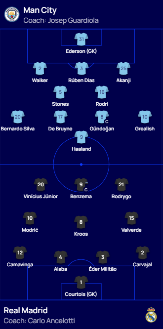 AEGoal cập nhật chính xác đội hình ra sân trận Man City vs Real Madrid diễn ra lúc 02h00 ngày 18/05/2023 trong khuôn khổ cúp C1 Châu Âu - UEFA Champions League
