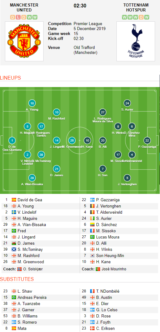 AEGoal.net cập nhật chính xác ĐỘI HÌNH RA SÂN trận Man Utd vs Tottenham diễn ra lúc 02h30 ngày 05/12 trong khuôn khổ Vòng 15 giải Ngoại Hạng Anh.